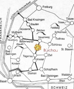 Autobahn A5 Hamburg-Basel, Ausfahrt Bad Krozingen oder Ausfahrt Müllheim,Neuenburg - Neuenweg, abbiegen Richtung Tegernau - Bürchau. Oder Ausfahrt Lörrach - Schopfheim - Tegernau - Bürchau. Von Osten kommend: Über Titisee - Feldberg - Todtnau - Schönau - Neuenweg - Bürchau.